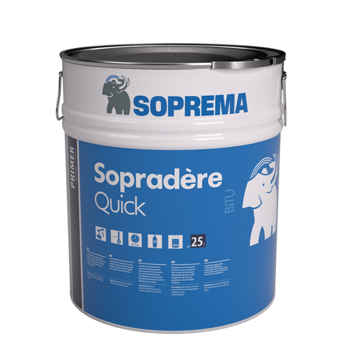 SOPREMA Quick wird als Bitumenvoranstrich nach den Technischen Regeln für die Planung und Ausführung von Abdichtungen mit Polymerbitumen- und Bitumenbahnen (abc der Bitumenbahnen vdd e.V.), Flachdachrichtlinien (ZvdH e.V.) und DIN 18531 ff. auf mineralischen Untergründen, Metall, Bitumenbahnen und anderen bitumen- und lösemittelbeständigen Untergründen verwendet, um eine zuverlässige Haftung bei der Verklebung oder Verschweißung von Bitumenbahnen zu erzielen. SOPREMA Quick ist nicht für die Verwendung in Innenräumen geeignet.